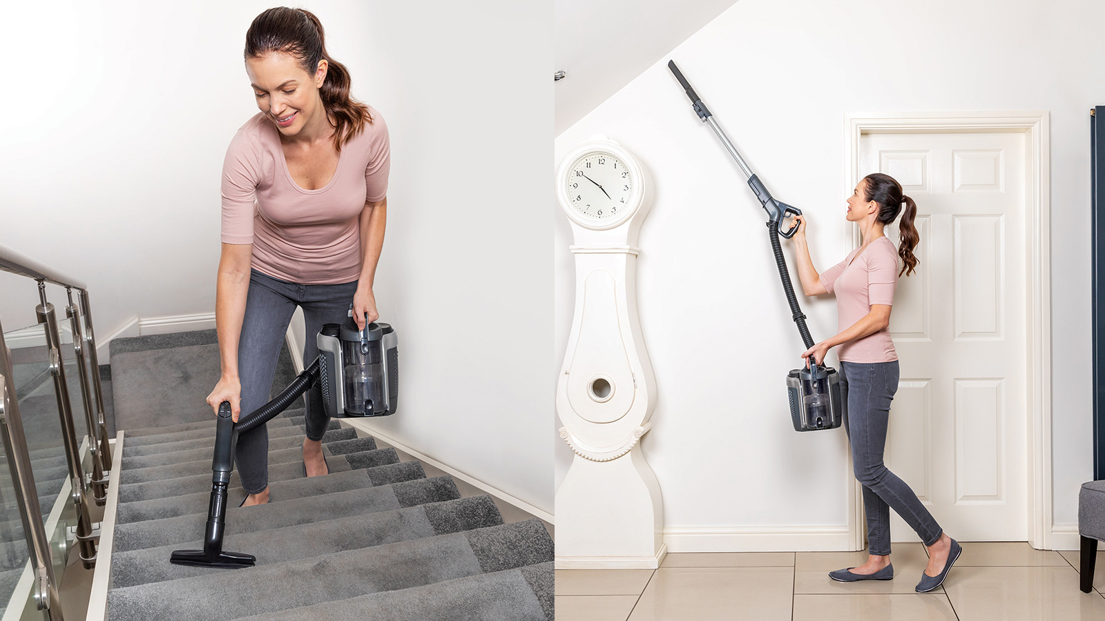 Bei demontierter Bodendüse erreichen Sie mit dem Saugrohr mühelos Decken, Vorhänge, Bilderrahmen und andere hoch gelegene Oberflächen. Nehmen Sie das Saugrohr ab, um das Gerät in einen portablen Handstaubsauger zu verwandeln, mit dem Sie mühelos Treppenstufen, Sofas, andere Möbelstücke oder Ihr Auto reinigen können.