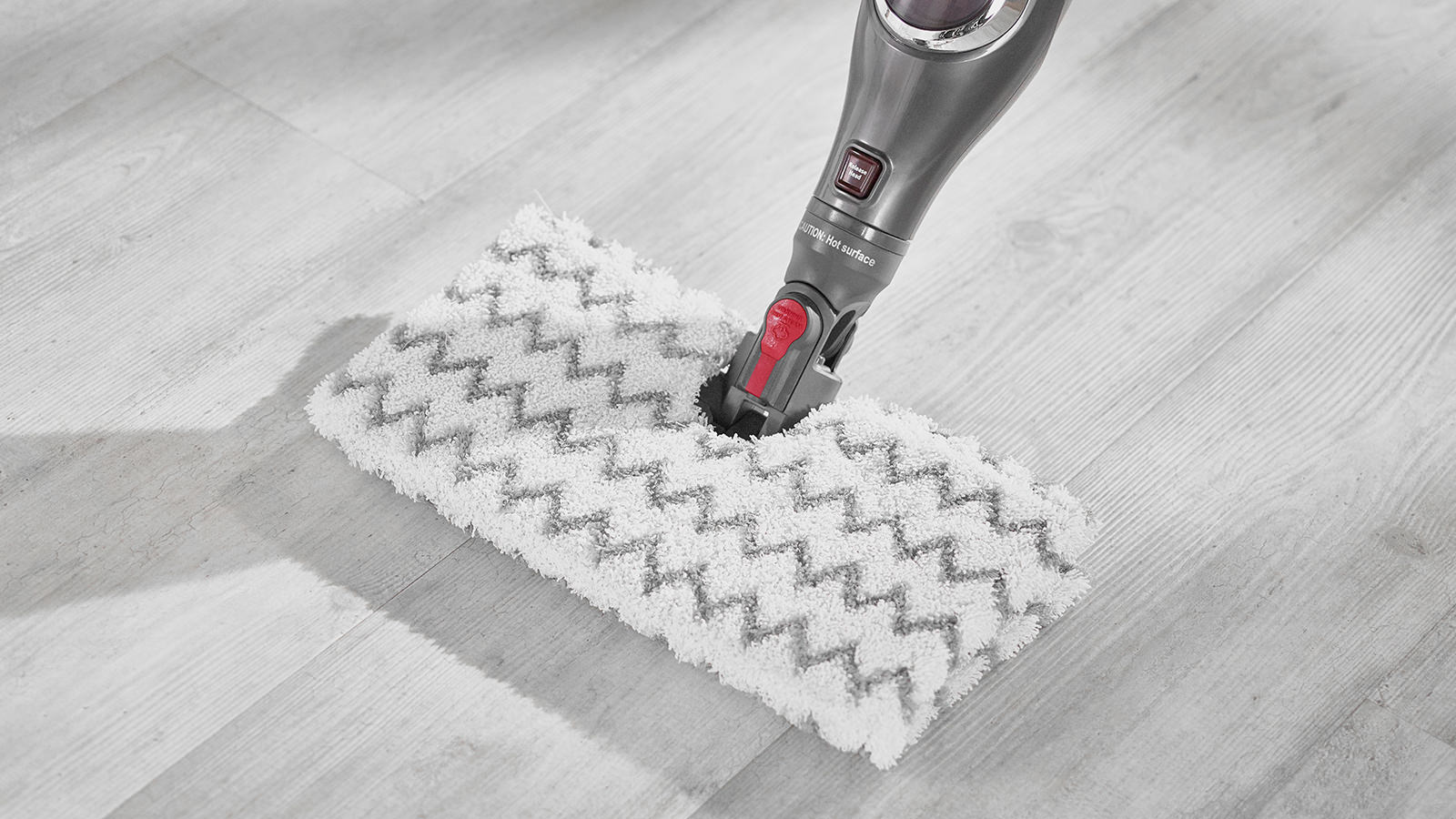 Genießen Sie streifenfreie Sauberkeit dank der gleichmäßig ausgerichteten Dampfdüsen innerhalb des Wischaufsatzes. Von besonders hartnäckigem Schmutz befreien Sie Ihre Hartböden, indem Sie den Dampfstrahlmodus aktivieren – klappen Sie dazu einfach den Wischaufsatz nach hinten. Aus der zentralen Düse dringt ein konzentrierter Dampfstrahl, der die Schmutzpartikel löst. Diese lassen sich nach Zurückklappen des Aufsatzes mit dem Wischbezug aufnehmen.